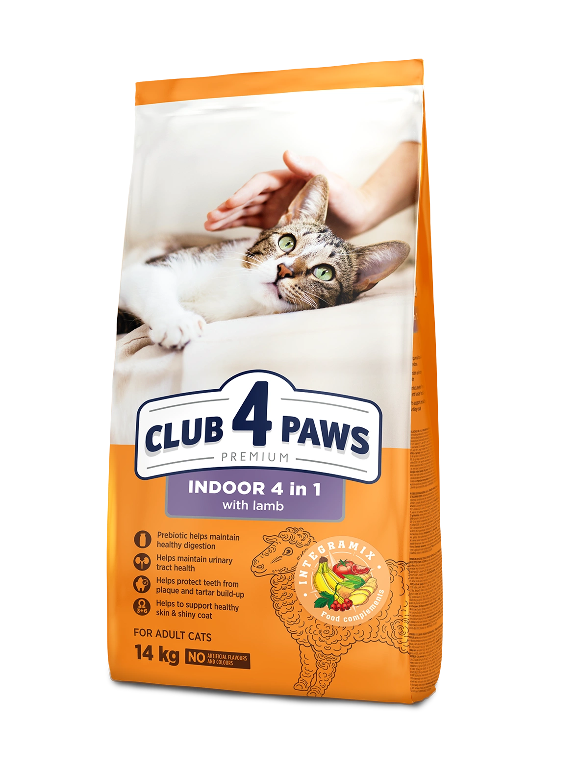 CLUB 4 PAWS Premium „Indoor 4 in1 ” pełnoporcjowa sucha karma dla kotów przebywających wyłącznie w pomieszczeniu „4 W 1” - jagnięcina - pełnoporcjowa sucha karma premium zawiera formułę “4 w 1” dla dorosłych kotów żyjących w pomieszczeniu kompleks Са, P i Mg zapewnia profilaktykę kamicy moczowej poprzez redukcję kryształów szczawianu w moczu, prebiotyk Bio-Mos i pulpa buraczana są odpowiedzialne za zdrowe trawienie, a mianowicie równowagę mikroflory jelitowej, granulki w karmie posiadają specjalny kształt i teksturę wspomagający czyszczeniu powierzchni zębów, zapobiegający występowaniu kamienia nazębnego oraz utrzymujący zdrowie jamy ustnej, kompleks niezbędnych nienasyconych kwasów tłuszczowych Omega 3 + Omega 6 sprawia, że skóra zwierzęcia jest zdrowa, a jego sierść jest piękna i błyszcząca.