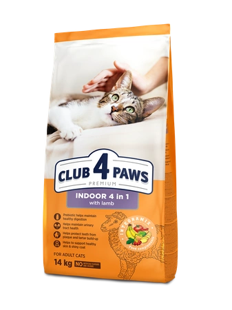 CLUB 4 PAWS Premium „Indoor 4 in1 ” pełnoporcjowa sucha karma dla kotów przebywających wyłącznie w pomieszczeniu „4 W 1” - jagnięcina 14 kg