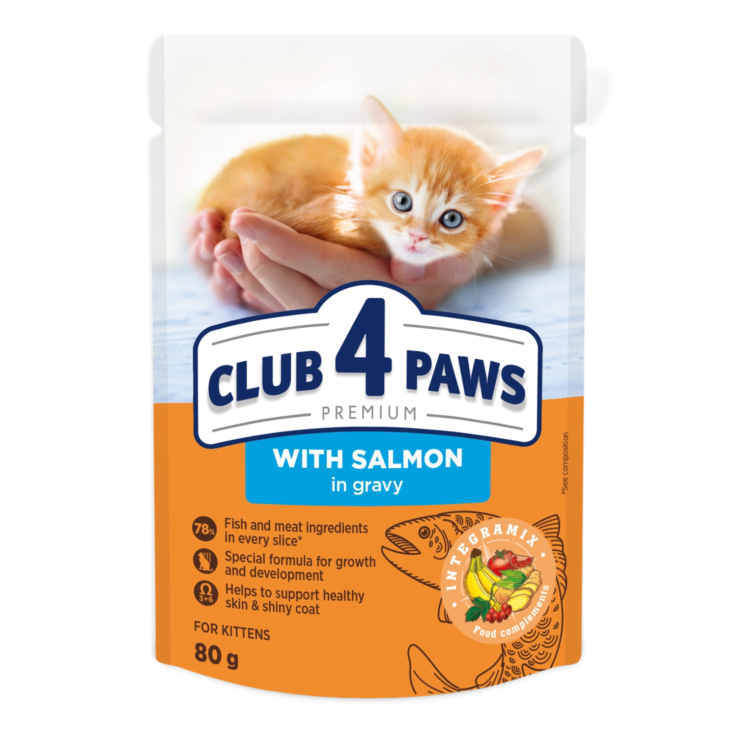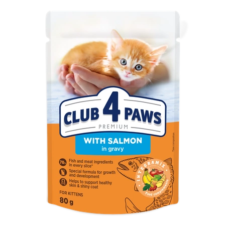 CLUB 4 PAWS Premium pełnoporcjowa mokra karma dla kociąt z łososiem w sosie - pełnoporcjowa mokra karma premium. Formuła rozwoju dla najmłodszych. Formuła ІNTEGRAMIX: suszone pomidory, imbir, głóg i banany – dla ogólnego wsparcia zdrowia i wzmacniania odporności ulubieńca.