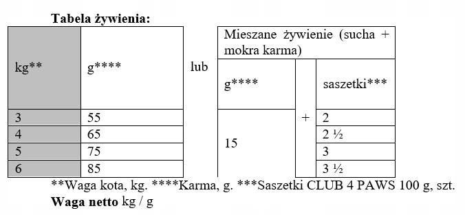 - kot o masie ciała 4 kg potrzebuje 65 g suchej karmy lub 15 g suchej karmy i 2+1/2 saszetki mokrej karmy dziennie,