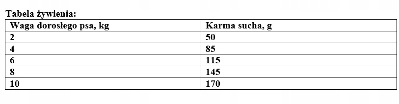 • pies o masie ciała 2 kg potrzebuje 50 g suchej karmy dziennie,