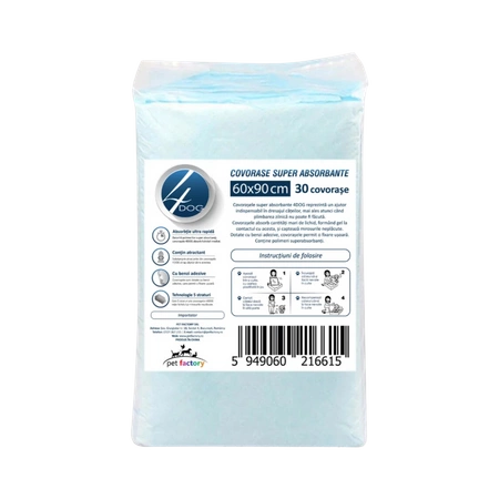 Pieluszki 4DOG pochłaniają dużą ilość płynu, tworząc w kontakcie z nim żel, a także wychwytują nieprzyjemne zapachy za pomocą pasków samoprzylepnych, które zapewniają łatwe mocowanie.