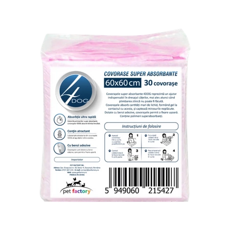 Pieluszki 4DOG pochłaniają dużą ilość płynu, tworząc w kontakcie z nim żel, a także wychwytują nieprzyjemne zapachy za pomocą pasków samoprzylepnych, które zapewniają łatwe mocowanie.