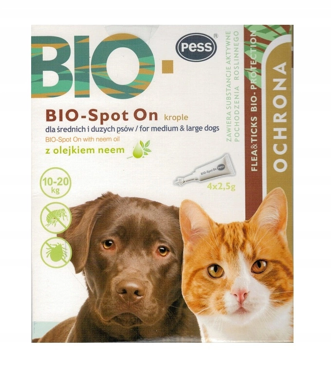 PESS Bio-spot On krople z olejkiem neem dla średnich i dużych psów i kotów 10-20 kg - 4 x 2 g
