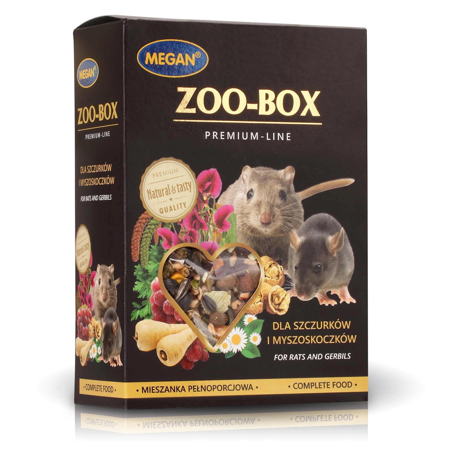 ZOO-BOX PREMIUM LINE to najwyższej jakości mieszanki dla małych gryzoni domowych. Bogaty skład mieszanek oparty jest o specjalnie wyselekcjonowane, w 100% naturalne, składniki, które w pełni zaspakajają potrzeby żywieniowe szczurków i myszoskoczków. Mieszanka jest chętnie zjadana przez zwierzęta.